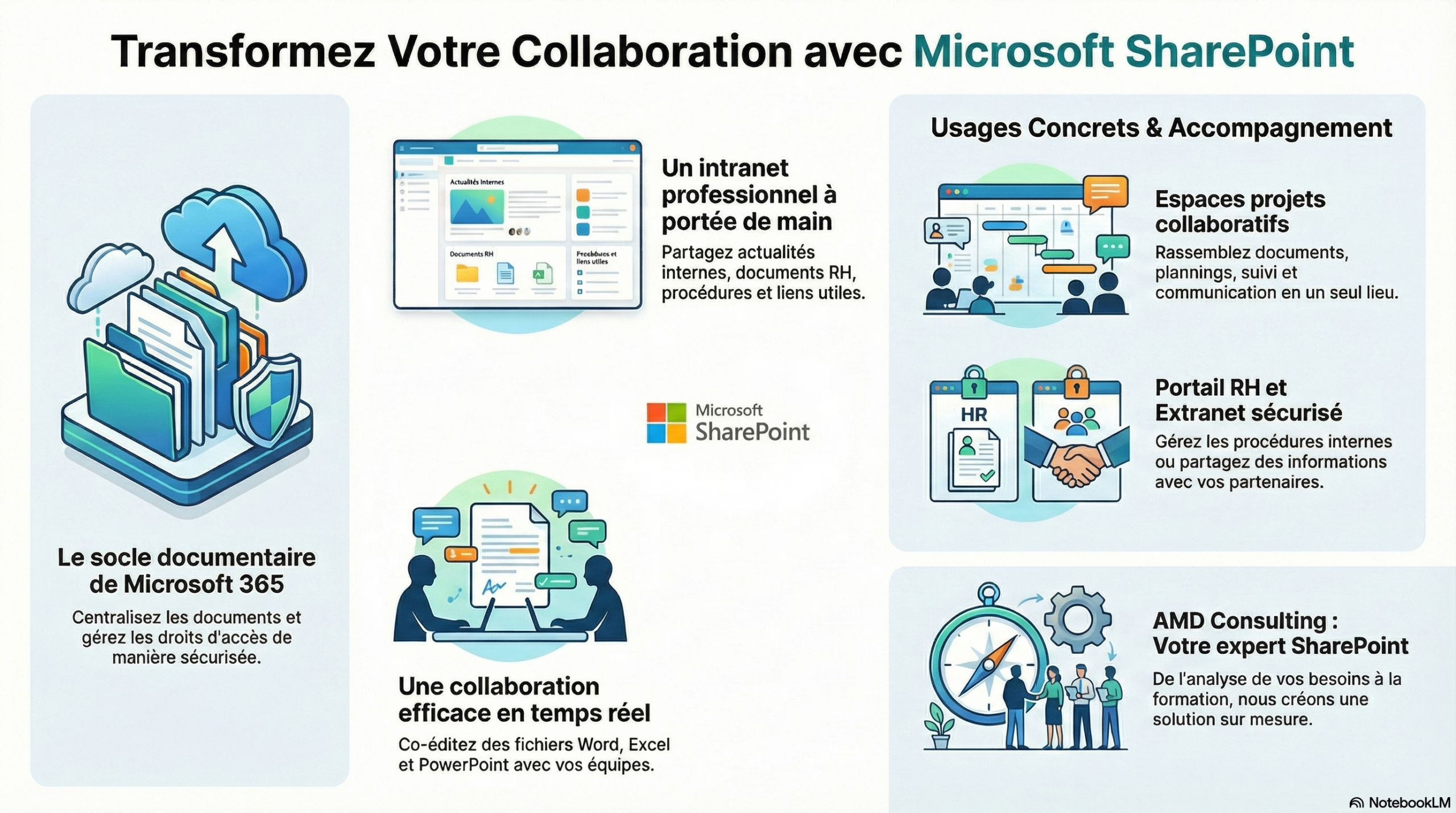 Microsoft SharePoint est la plateforme idéale pour centraliser vos documents, créer un intranet moderne et améliorer la collaboration entre vos équipes, le tout intégré à Microsoft 365.